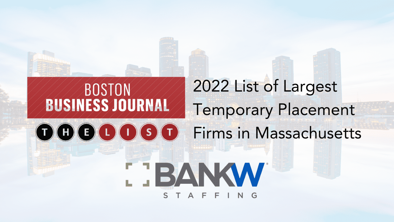Bedford, NH – BANKW Staffing has been recognized alongside some of Massachusetts’ most prestigious organizations in Boston Business Journal’s Book of Lists 2022. Distinguished as 7th overall Largest Massachusetts Temporary Placement firm, BANKW Staffing’s success in temporary placements is proven by an outstanding 253% increase in Massachusetts-based temporary hires from 434 in 2020 to 1,533 temporary placements in 2021.